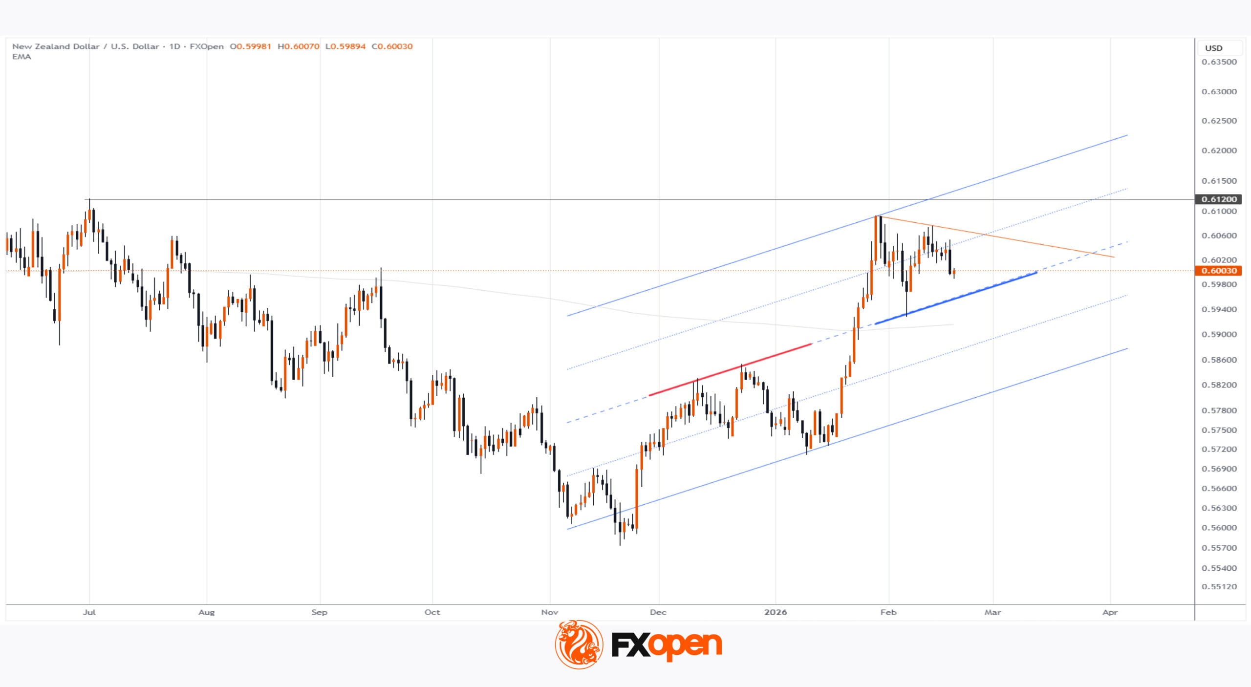 Since late autumn 2025, the pair had been trending higher, forming a well-defined ascending channel. Over time, the channel’s median line transitioned from resistance into support, as illustrated by the thicker markings on the chart.