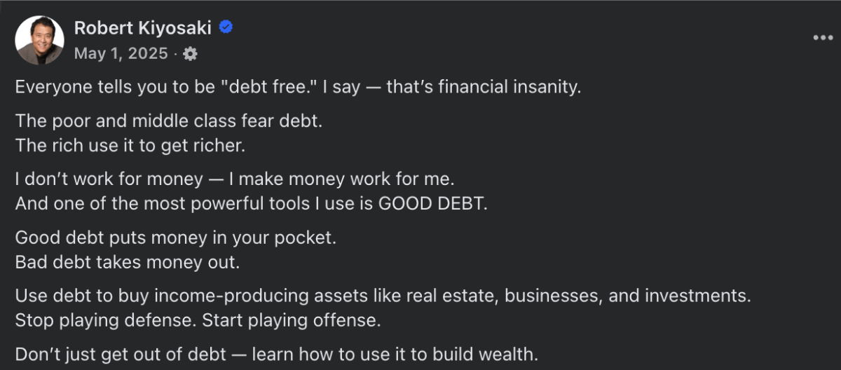 Kiyosaki, unlike most other pop finance heads, is a big “spend money to make money” proponent. In a 2025 Facebook post, he urges his followers to take on debt in order to fund the purchases of “income-producing assets like real estate, businesses, and investments.”